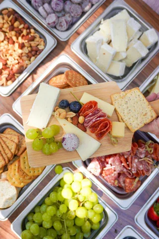 Our charcuterie bar features up to 12 gourmet meats, cheeses, and sides, all served by a dedicated team member